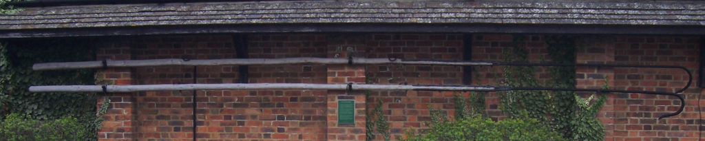This photo shows Fire hooks for removing thatch from roofs. Seven men wielded each hook, with ropes attached to the shafts for pulling down the roof covering to create a fire break. These hooks are now on permanent open display at Hook Court, High Street, West Lavington.